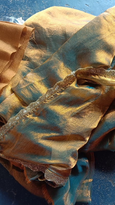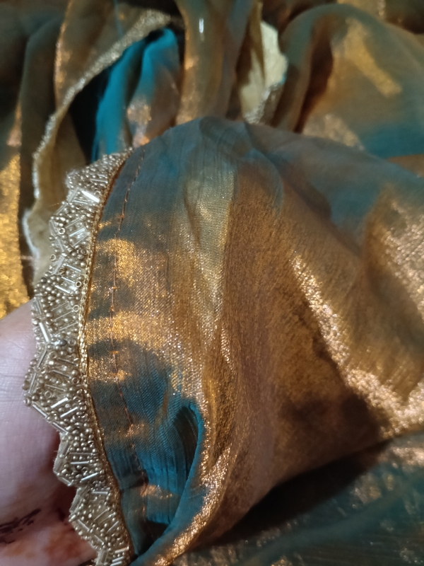 This stunning gold and Rama green two-tone saree is a masterpiece of elegance and luxury, perfect for weddings, festive celebrations, and grand gatherings. Crafted from soft fancy chiffon silk, it drapes beautifully, offering a lightweight and flowy texture that enhances your grace and charm.
